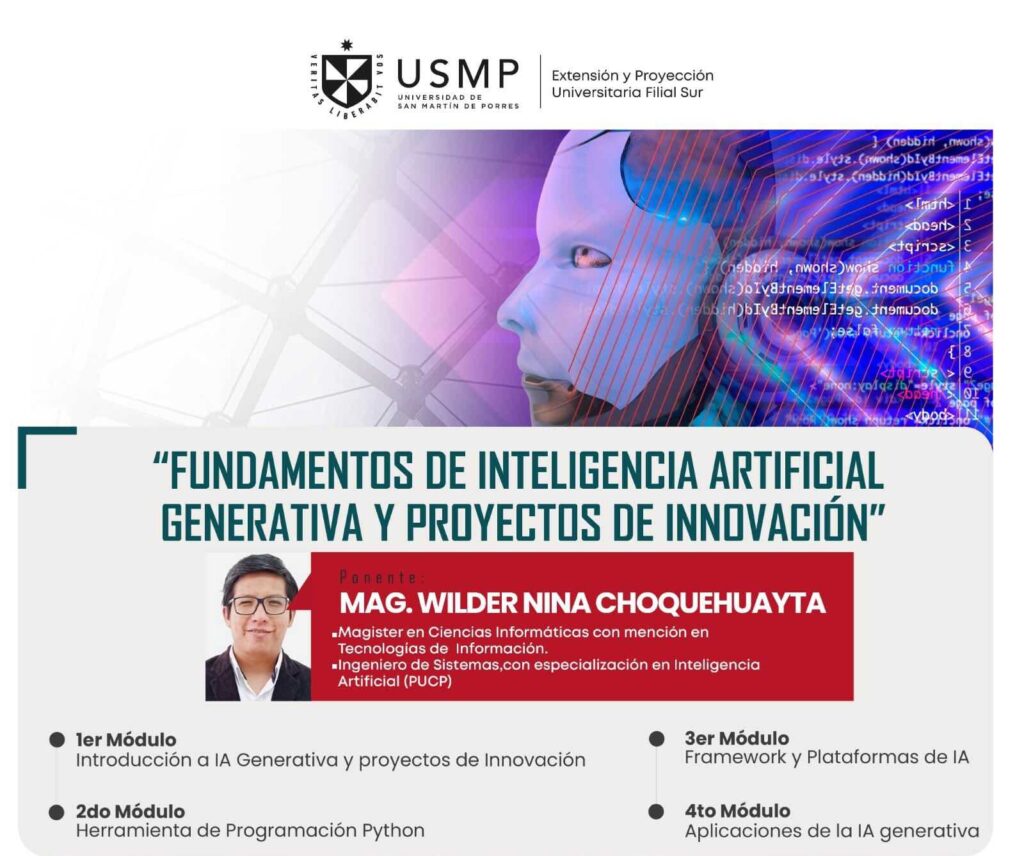 La Universidad de San Martín de Porres, Filial Sur, desarrolló el curso “Fundamentos de Inteligencia Artificial Generativa y Proyectos de Innovación”, orientado a estudiantes, profesionales y público interesado en potenciar sus competencias en inteligencia artificial y gestión de proyectos innovadores.