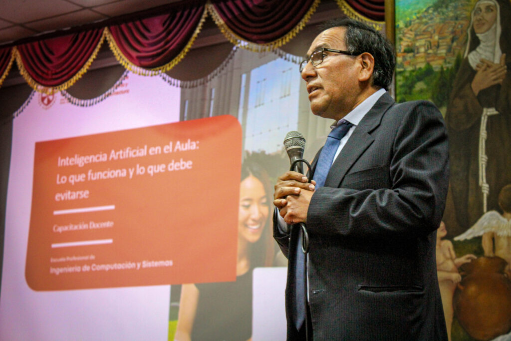 Los talleres vienen siendo dictados por los Mg. Ing. Guido Anco Chambilla y María del Carmen Paredes de Calienes, docentes de la carrera, quienes comparten experiencias, herramientas y estrategias pedagógicas orientadas a la integración responsable de la IA en las aulas.