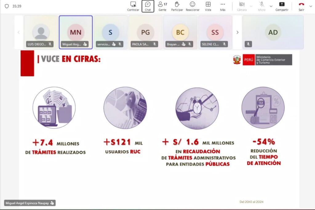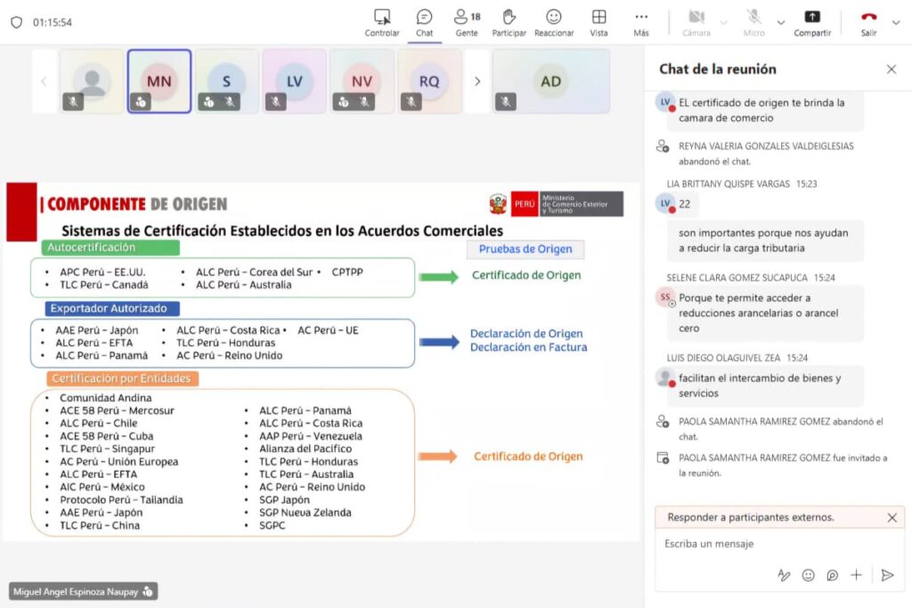 La Universidad de San Martín de Porres – Arequipa y el Ministerio de Comercio Exterior y Turismo – MINCETUR, continúan impulsando la formación en comercio internacional mediante un segundo taller práctico sobre la Ventanilla Única de Comercio Exterior – VUCE. Este evento, realizado de manera virtual el 7 de noviembre, contó con la participación de 25 estudiantes y 5 docentes, reafirmando el compromiso de ambas instituciones por preparar a futuros profesionales en herramientas digitales clave para el sector exportador.
