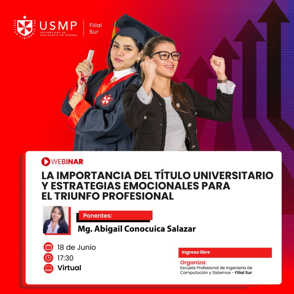Con el propósito de fortalecer la orientación profesional de sus estudiantes, la Universidad de San Martín de Porres, Filial Sur, realizó el webinar “La importancia del título universitario y estrategias emocionales para el triunfo profesional”, dirigido a alumnos y jóvenes egresados interesados en potenciar su desarrollo personal y laboral.